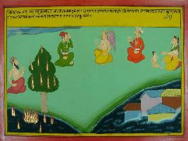 | Description / विवरण | Miniature painting based on Mahabharat - Ashwamegh parva depicting a seen of a natural destruction where Brishketu is talking to Pradyuman. On top Garuda also depicted. |