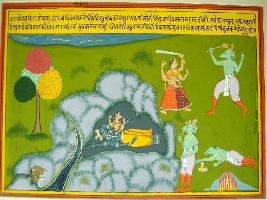 | Description / विवरण | Miniature painting based on Ekadashi Mahatmya depicting Ekadashi worship of Migsar depicting fight between devi and demon and devi defeats him. It makes the day auspicious for worship. |