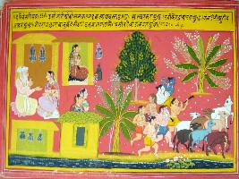 | Description / विवरण | Miniature painting based on Harivansha depicting the childhood of Krishna. He is depicted playing and herding the cows with gopas in the left part. In right part, Nanda is depicted talking with Yashoda. |