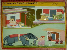 | Description / विवरण | Miniature painting depicting Mullah-do-Piyaja telling Akbar, elephant rider though do care for his elephant but sometimes that elephant becomes the cause for his death. |