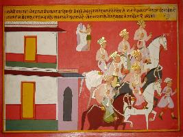 | Description / विवरण | Miniature painting based on Prithviraj Raso depicting Kotwal asks Jaichand that Ravan has 10000 cavalry soldier and each soldier is so brave and strong that they can throw the Meru mountain. On the painting a palace is seen in the right side while the soldier are visible in the left side. |