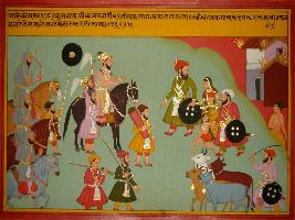 | Description / विवरण | Miniature painting based on Prithviraj Raso depicting emperor Ghauri attacking Kannauj and torturing its citizens, burning the houses and capturing the animals. |
