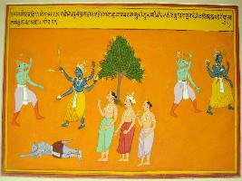 | Description / विवरण | Miniature painting based on Ekadashi Mahatmya depicting Ekadashi of Migsar month depicting fight between demon and Vishnu and other gods watching them. |