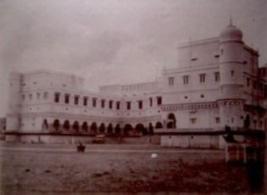 | Description / विवरण | In this photograph, a double storied building is shown. There is open space in front of It, in which people are engaged in cleaning. It is the photograph of Sariska Palace. |