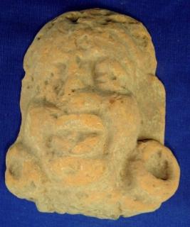 | Description / विवरण | Terracotta human head with bulging eyes, thick lips and wearing round earrings. |