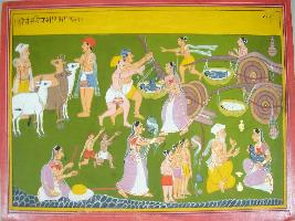 | Description / विवरण | Miniature painting based on Harivansha depicting life of Vrindavan and child Krishna and Balram sleeping in a bed. At the lower left corner Nanda and Yashoda with Krishna in her lap is seen. |