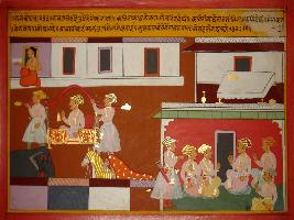 | Description / विवरण | Miniature painting based on Prithviraj Raso depicting Ravan talking to poet Chandvardai. After that he went to meet Jaichand in palanquin. |