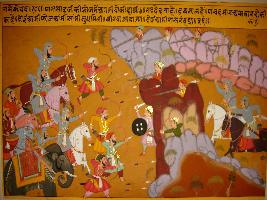 | Description / विवरण | Miniature painting based on Prithviraj Raso depicting fight between Badshah Mohammad Ghauri and soldiers of Prithviraj Chauhan. |