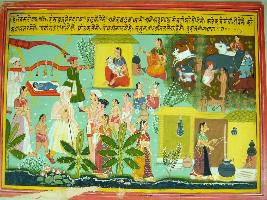 | Description / विवरण | Miniature painting based on Harivansha depicting different scenes as his childhood in which Hari shown in Paalki, Yashoda talking him in her lap, Hari with his friend Sudama. |