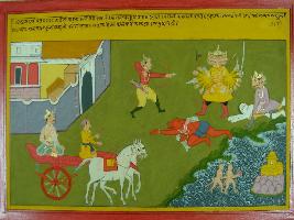 | Description / विवरण | Miniature painting based on Mahabharat - Ashwamegh parva depicting Sita is going to the forest, one fox came and told that Sita is not good woman as for her fight between Ram and Ravan had happened. |
