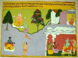 | Description / विवरण | Miniature painting based on Ekadashi Mahatmya depicting Ekadashi of Magh month depicting Indra telling Vishnu about the demon of Chandravati that he has blessings of Brahma. |