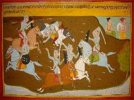 | Description / विवरण | Miniature painting based on Prithviraj Raso depicting war scene. Army of Prithviraj fighting with the soldiers of Panga kingdom. The solders are on horsed and carrying weapons. At the upper left part, Prithviraj Chauhan shown leaving the battlefield. |