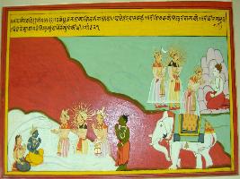 | Description / विवरण | Miniature painting based on Ekadashi Mahatmya depicting Ekadashi of Magh month depicting Devtas being defeated by demons, reaches to Shiv for help and Shiv asks them to go to lord Vishnu. |