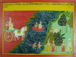 | Description / विवरण | Miniature painting based on Mahabharat - Ashwamegh parva depicting Sita and Lakshman riding on chariot while they saw river Ganga and they cross the river on boat and going to forest. |