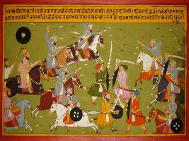 | Description / विवरण | Miniature painting based on Prithviraj Raso depicting Tar khan and Mohammad Ghauri fighting fiercely with the army of Prithviraj Chauhan. |