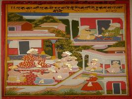 | Description / विवरण | Miniature painting based on Mullah-do-Piyaja. It depicts many people talking to a noble, it seems that they are discussing something about tribute and tax. |