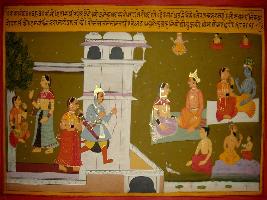 | Description / विवरण | Miniature painting based on Prithviraj Raso. Sanjogita and Prithviraj is depicted in a palace with maids, outside the palace is depiction of a king with queen, Krishna with Radha, sage with his son and on top Brahma is depicted. |