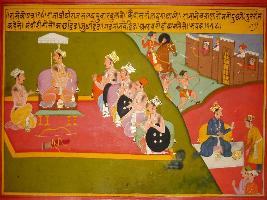 | Description / विवरण | Miniature painting based on Prithviraj Raso depicting Raja Prithviraj sitting in court with courtesans and planning for war. At the lower left side, ministers are shown sitting and taking food. At the upper left, army is shown attacking a fort. |