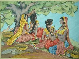| Description / विवरण | Portrait painting depicting four women sitting on the bank of river under a tree for a rest from work and they are making hairs of each other. |