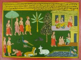 | Description / विवरण | Miniature painting based on Mahabharat - Ashwamegh parva depicting Balmiki asked Sita about her identity and reason for her being in forest. Sita told her that she is daughter of Janak. Then rishi told him that he is Balmiki rishi and friend of king Janak. He asked her to come with him in his hermitage. In ashram, wife of rishi came toward her and welcome her. She gave birth to Luv and Kush. |