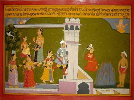 | Description / विवरण | Miniature painting based on Prithviraj Raso. Prithviraj is depicted in a palace with many women, he is depicted taking out Sanjogita from her palace and friends of Sanjogita are worried and sad. |