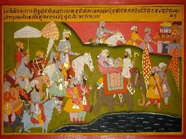 | Description / विवरण | Miniature painting based on Prithviraj Raso. Badshah Ghauri is depicted marching into the city after his victory on Prithviraj Chauhan on an elephant, ahead his army consisting of cavalry and infantry, some of his men depicted setting fire the houses of the city. |