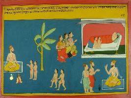 | Description / विवरण | Miniature painting based on Mahabharat - Ashwamegh parva depicting Sita giving birth to two son after her stay of 7 months in ashram of Balmiki. Women in rishi s ashram celebrated their birth with singing songs. Rishi performed Jatkarma ceremony of both boy. |