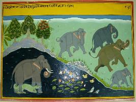 | Description / विवरण | Miniature painting based on Gajendramoksha depicting Gajendra getting caught by a crocodile in a river and other elephants are shown running away. |