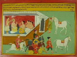 | Description / विवरण | Miniature painting based on Mahabharat - Ashwamegh parva depicting Ram ruling in Ayodhya but suffering from sin of Brahma Hatya. He asked Vashishth for way to get rid of that sin and Vashishth ask him to perform Ashwamegh yagna with white horse. |
