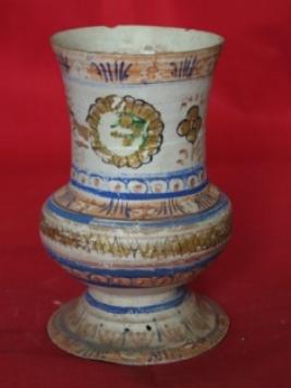 | Description / विवरण | This is a small flower vase with large cylindrical neck whose mouth is slightly outward and main body is in concave shape. It is glazed with floral motifs. |