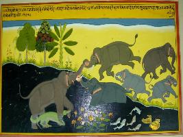 | Description / विवरण | Miniature painting based on Gajendramoksha depicting Gajendra caught by the crocodile. Two elephants are depicted trying to take out Gajendra from water, other elephants are depicted running for help, fishes and ducks are also seen in the lake. |