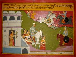 | Description / विवरण | Miniature painting based on Prithviraj Raso depicting Prithviraj with female attendants and Kana is on horseback saw Prithviraj is going to marry Sanjogita. |