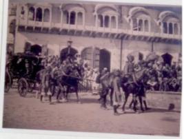 | Description / विवरण | This is marriage photograph black and white, in which group of man are shown. Some horses can also be seen. In the background, few portions of the palace can be seen. |