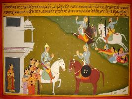| Description / विवरण | Miniature painting based on Prithviraj Raso. A palace is depicted outside which Prithviraj is depicted with some women, on the other side is depiction of a battle, two men fighting on horseback and four dead bodies are lying on ground. |