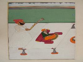 | Description / विवरण | It is a miniature painting divided in three section of foreground, background; deals with a young prince alongwith his attendant. While prince is shown sitted in a rectangular stand, his attandent shown standing with holding a fly-whisk. Lake or a river is shown at the middle ground while at background sky-cloud is shown in multicolour. |