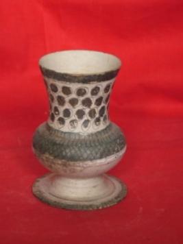 | Description / विवरण | Flower vase with a small globular belly and a long neck widening upwards and a circular pedestal. On the neck, circles are depicted and on the belly criss-cross patterns are depicted. |