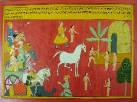 | Description / विवरण | Miniature painting based on Mahabharat - Ashwamegh parva depicting Luv caught the horse of Ashwamegh, read the letter that horse belong to Ram. He took the horse along with him and tied it with banana tree. It also depict that army of Ram coming behind the horse. |