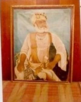 | Description / विवरण | Thakur Hamumat Singh is wearing white turbans with golden lines and decorated with pearls and stone and a rectangular bond with square compartments of several colours, white jama and the golden robe is sitting by crossed legs. He is wearing a golden bangle in feet and a silver ring of swords. The hut is visible at the left side and daggers handle and waist. He has a towel of white colour with floral printing on one side and a shield at another side. |