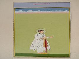 | Description / विवरण | It is a miniature painting of Maharaj Jagat Singh ji, standing on a green ground, with large middle ground. He is shown holding a sword in a hand, while a flower, symbol of piece in other, having round halo round him to show him as devine being. Rosary of pearl, etc. king is decorated in with bracelet, ear ring. At the background sky and cloud is shown. |
