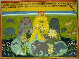 | Description / विवरण | Miniature painting based on Gajendramoksha depicting two people on the top of the hill surrounded by a river. Four elephants are depicted in violent mood and they are breaking trees and animals are running away from them in fear. |