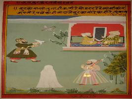 | Description / विवरण | Miniature painting based on Mullah-do-Piyaja. It depicts a man holding a sword and standing in front of a woman wearing a white coloured Burqa. |