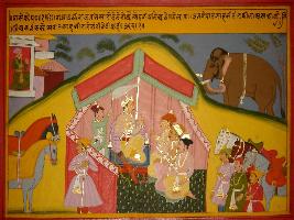 | Description / विवरण | Miniature painting based on Prithviraj Raso depicting Prithviraj sitting in the tent with his commanders. A defector of Badshah came and giving some information to Prithviraj. |