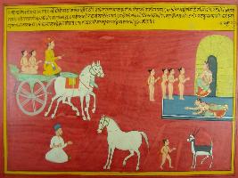| Description / विवरण | Miniature painting based on Mahabharat - Ashwamegh parva depicting horse moving ahead and all the friends of Luv reaches to Sita and told her that Luv got faint and army men took him away. Listening to this, Sita got fainted and then Kush came and supported Sita by saying that he will bring Luv. |