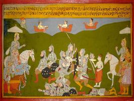 | Description / विवरण | Miniature painting based on Prithviraj Raso depicting fight between armies of Prithviraj and Ghauri depicting Nan Singh surrounded by enemy and finally killed by them. |