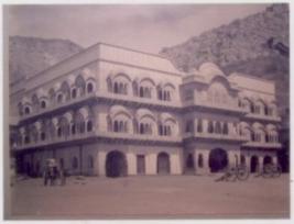 | Description / विवरण | This is a black and white photograph. This photograph represents the City Palace of Alwar. In the background of this palace, a small hillock can be seen on the top this a fort is constructed. |