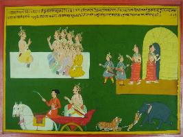 | Description / विवरण | Miniature painting based on Mahabharat - Ashwamegh parva depicting Kush saying to his mother that Yam, Indra, Varun all will help him in freeing of Luv. Then Sita went in to the hut and dressed up Kush for fight. Kush going for fight as if a cub attacks an elephant for flesh. |