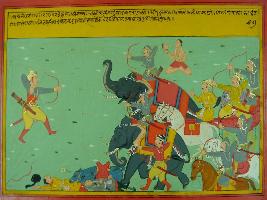 | Description / विवरण | Miniature painting based on Mahabharat - Ashwamegh parva depicting Kush fighting with the army of Ram and destroyed it, by killing many elephants and horses. |