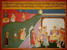 | Description / विवरण | Miniature painting based on Prithviraj Raso depicting Jaichand and king Hajurchand sitting in garden and meeting Kamdev. In upper part Lord Vishnu is depicted. In left part, court of king Jaichand is depicted. |