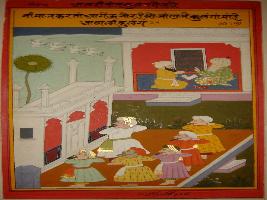 | Description / विवरण | Miniature painting based on Mullah-do-Piyaja. It depicts Mullah-do-Piyaja is telling Akbar. that all people are doing Namaj behind the Imam. |