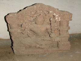 | Description / विवरण | This sculpture depicts a four arm god, probably Indra. He is shown holding vajra or tridentand sitted in a lalitasana. He is holding a goad in other hand and decorated with necklace. |